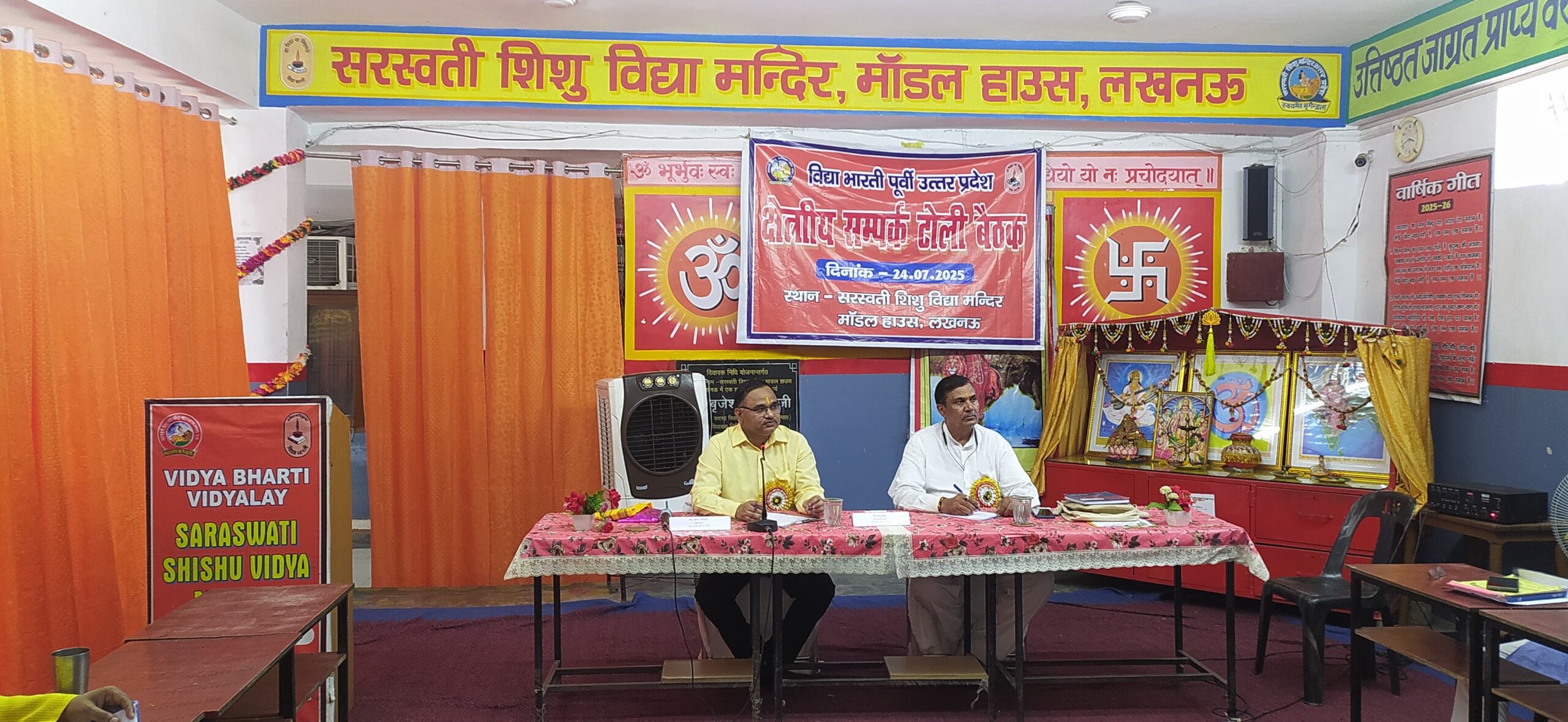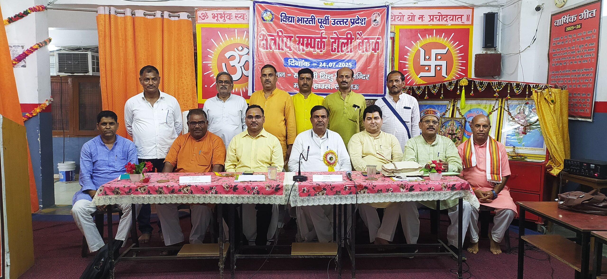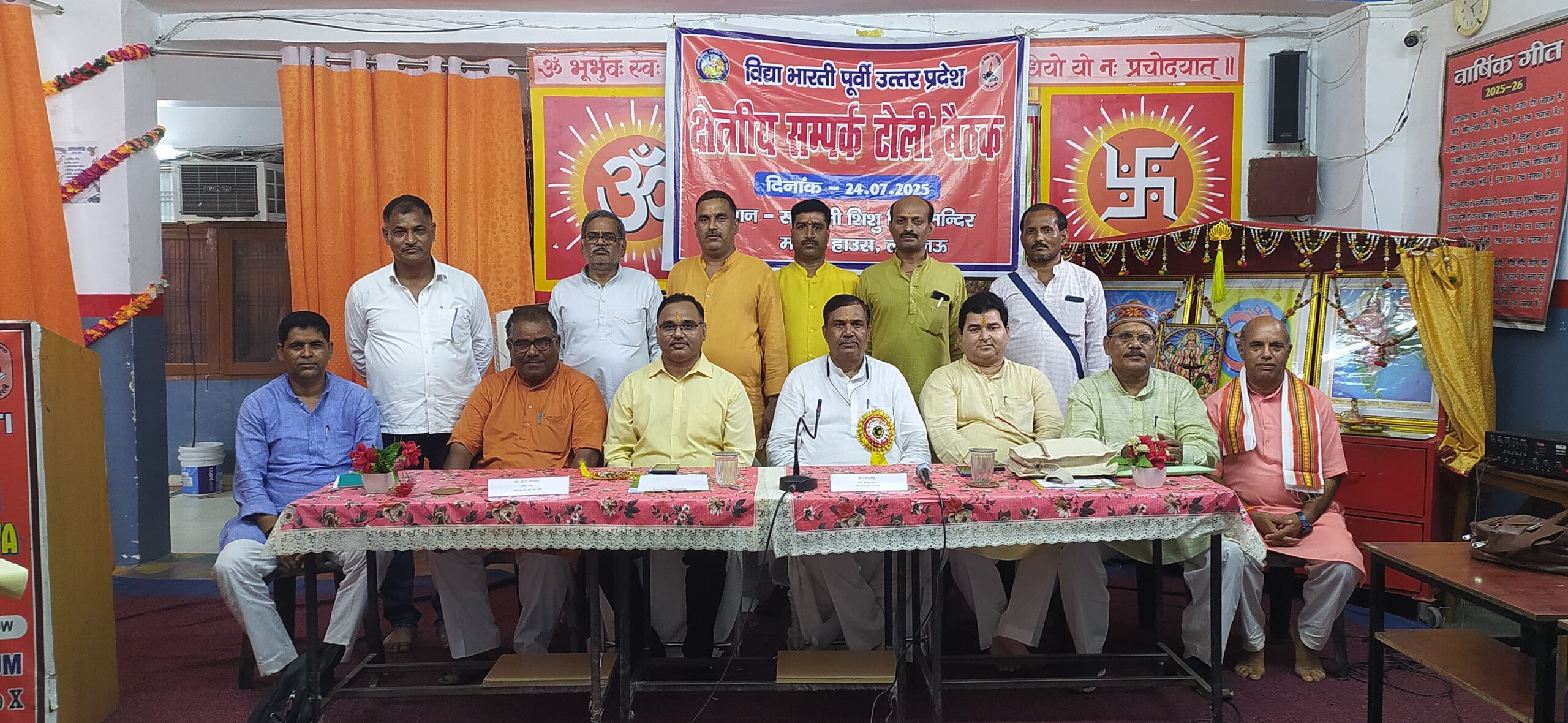 आज दिनॉक 24.07.2025 की प्रातः 9ः00 बजे से सायं 5 बजे तक क्षेत्रीय सम्पर्क टोली की बैठक विभिन्न सत्रों के द्वारा सरस्वतीशिशु विद्या मन्दिर मॉडल हाउस लखनऊ में सम्पन्न हुई | मा0 डॉ0 सौरभ मालवीय जी क्षेत्रीय मंत्री विद्या भारती पूर्वी उ0प्र0 द्वारा कार्य विस्तार एवं सम्पूर्ण कार्यक्रम सम्पर्क विभाग के बैनर तले सम्पन्न करने हेतु जोर दिया गया। समाज के हर वर्ग के प्रत्येक व्यक्ति से सम्पर्क करना है तथा पंच परिवर्तन के विषयों पर व्याख्यान माला का आयोजन अवश्य किया जाए। WORK NETWORK LUCK – NETWORK के माध्यम से समाज के बन्धुओं को जोड़ते हुए लक्ष्य को प्राप्त करना। क्षेत्र में रहने वाले प्रबुद्ध वर्ग को सूचीबद्ध करके विद्यालय के कार्यक्रमों में सहभागी बनाए। कार्यक्रम का समापन शान्ति मंत्र के साथ किया गया।