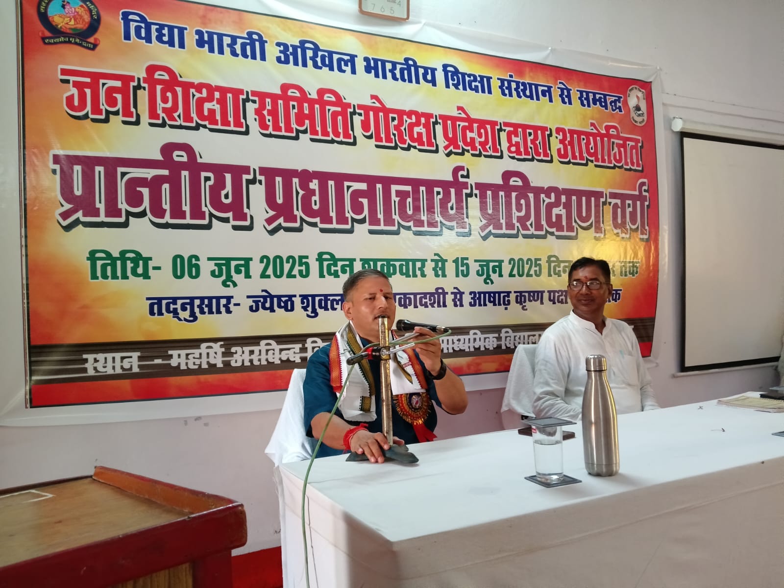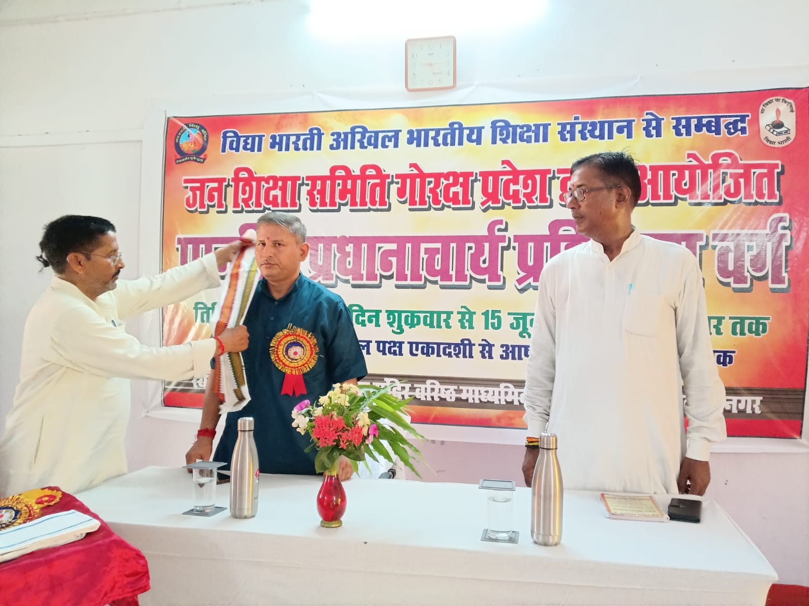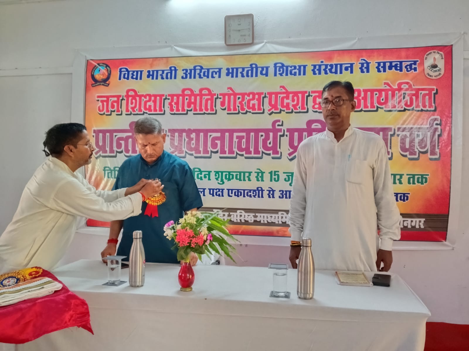 विद्या भारती जन शिक्षा समिति गोरक्ष प्रदेश द्वारा आयोजित प्रांतीय प्रधानाचार्य प्रशिक्षण वर्ग के पांचवें दिन विद्या भारती पूर्वी उत्तर प्रदेश क्षेत्र के सह क्षेत्रीय संगठन मंत्री डॉ राम मनोहर जी ने मां सरस्वती के चरणों में दीप प्रज्वलित कर विद्या भारती का लक्ष्य विषय पर अपना मार्गदर्शन दिया। महर्षि अरविन्द विद्या मंदिर वरिष्ठ माध्यमिक विद्यालय कसया कुशीनगर के वरिष्ठ आचार्य रणजीत उपाध्याय जी बैज लगाकर व अंगवस्त्र भेंट कर स्वागत किया। अपने उद्बोधन में क्षेत्रीय सह संगठन मंत्री जी ने कहा कि प्रतिदिन कुछ ना कुछ हम याद करें।मानव शरीर से हमारा परिचय और आत्मीय संबंध होना चाहिए। हमें अपने’ त्व ‘को विकसित करना चाहिए।जैसी दृष्टि वैसी सृष्टि का भाव जगता है। संस्कार का पक्ष हमारी भावना से है। डॉ राममनोहर जी ने कहा कि हम अपने वैशिष्ट्य को ना भूलें। यदि हम एक आचार्य हैं तो हमें विद्या भारती का लक्ष्य , गीता का स्मरण करना,