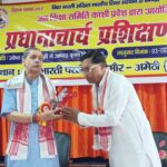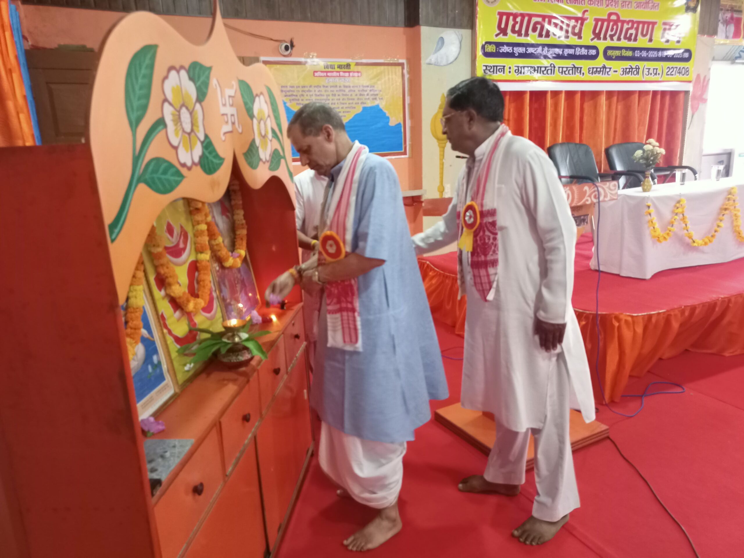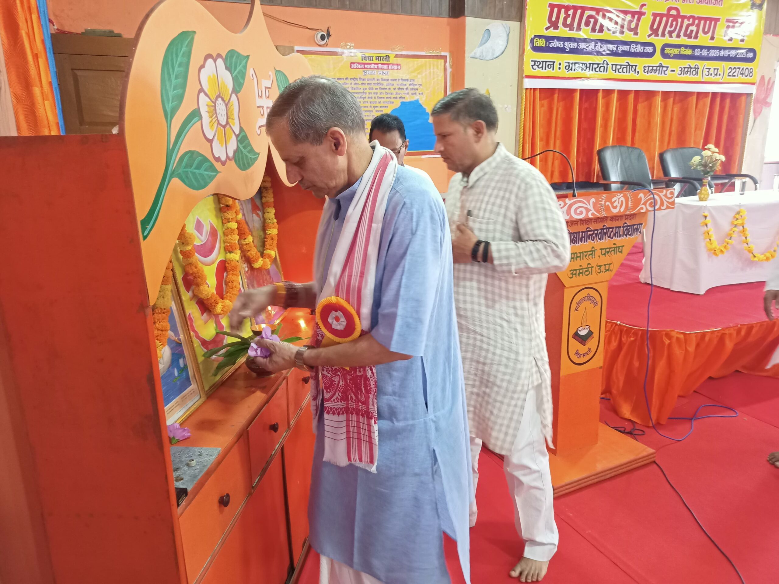 जन शिक्षा समिति काशी प्रदेश द्वारा आयोजित 10 दिवसीय प्रधानाचार्य प्रशिक्षण वर्ग 2025 के तृतीय दिवस पर वंदना सत्र में विद्या भारती पूर्वी उत्तर प्रदेश के क्षेत्रीय संगठन मंत्री हेमचंद्र जी द्वारा मां सरस्वती के चित्र पर पुष्पार्चन एवं वंदन के उपरांत कार्यक्रम का शुभारंभ हुआ ।
