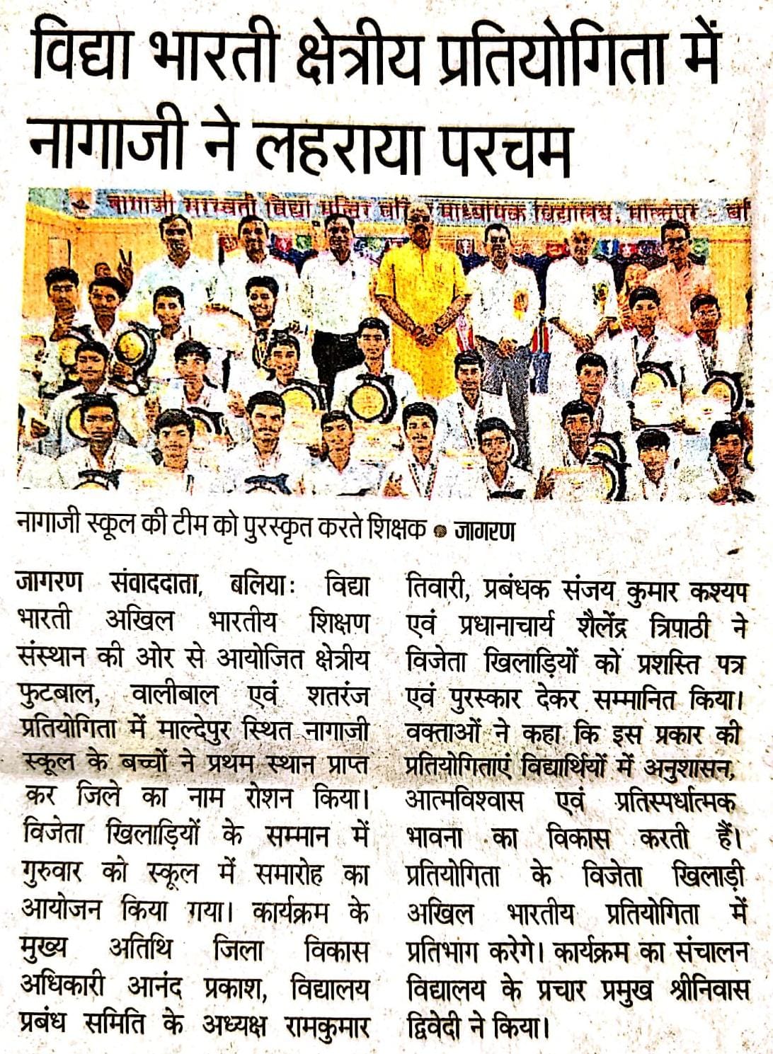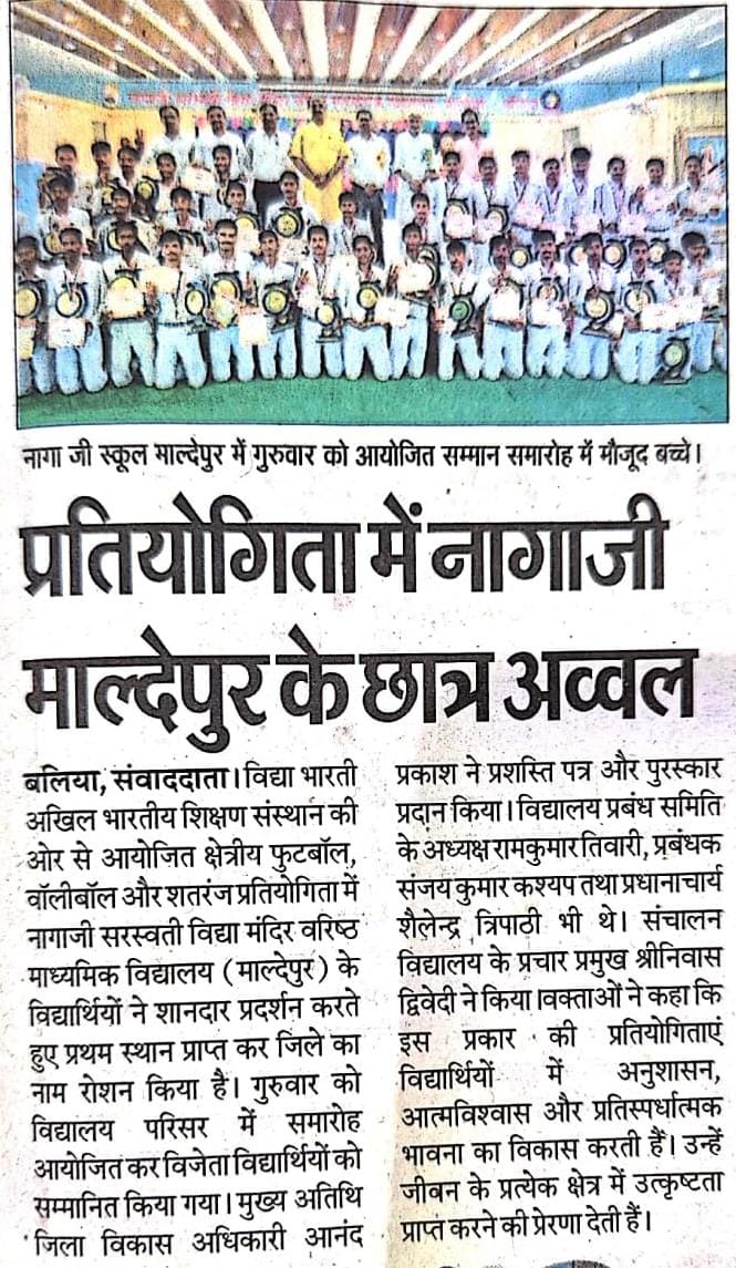 рдмрд▓рд┐рдпрд╛ред рд╡рд┐рджреНрдпрд╛ рднрд╛рд░рддреА рдЕрдЦрд┐рд▓ рднрд╛рд░рддреАрдп рд╢рд┐рдХреНрд╖рдг рд╕рдВрд╕реНрдерд╛рди рджреНрд╡рд╛рд░рд╛ рдЖрдпреЛрдЬрд┐рдд рдХреНрд╖реЗрддреНрд░реАрдп рдлреБрдЯрдмреЙрд▓, рд╡реЙрд▓реАрдмреЙрд▓ рдПрд╡рдВ рд╢рддрд░рдВрдЬ рдкреНрд░рддрд┐рдпреЛрдЧрд┐рддрд╛ рдореЗрдВ рдирд╛рдЧрд╛рдЬреА рд╕рд░рд╕реНрд╡рддреА рд╡рд┐рджреНрдпрд╛ рдордВрджрд┐рд░ рд╡рд░рд┐рд╖реНрда рдорд╛рдзреНрдпрдорд┐рдХ рд╡рд┐рджреНрдпрд╛рд▓рдп, рдорд╛рд▓реНрджреЗрдкреБрд░, рдмрд▓рд┐рдпрд╛ рдХреЗ рднреИрдпрд╛рдУрдВ рдиреЗ рдЙрддреНрдХреГрд╖реНрдЯ рдкреНрд░рджрд░реНрд╢рди рдХрд░рддреЗ рд╣реБрдП рдкреНрд░рдердо рд╕реНрдерд╛рди рдкреНрд░рд╛рдкреНрдд рдХрд┐рдпрд╛ рдФрд░ рдЬрд┐рд▓реЗ рдХрд╛ рдЧреМрд░рд╡ рдмрдврд╝рд╛рдпрд╛ред