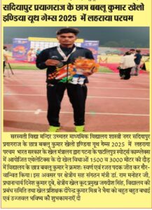 बिहार राज्य के पाटलिपुत्र काम्प्लेक्स में 4 मई से 15 मई 2025 तक आयोजित खेलो इंडिया यूथ गेम्स 2025 में विद्याभारती पूर्वी उ०प्र० के विद्यालय ज्वाला देवी सरस्वती विद्या मन्दिर इंटर कॉलेज गंगापुरी रसूलाबाद प्रयागराज के खिलाडी भैया आर्य देव ने पोल वाल्ट में तथा सरस्वती विद्या मन्दिर उच्चतर माध्यमिक विद्यालय शास्त्री नगर सदियापुर के होनहार छात्र बबलू कुमार ने दौड़ में स्वर्ण पदक के साथ जीत दर्ज कर शिक्षा के साथ-साथ खेल के क्षेत्र में भी विद्यालय का मान बढाया है |