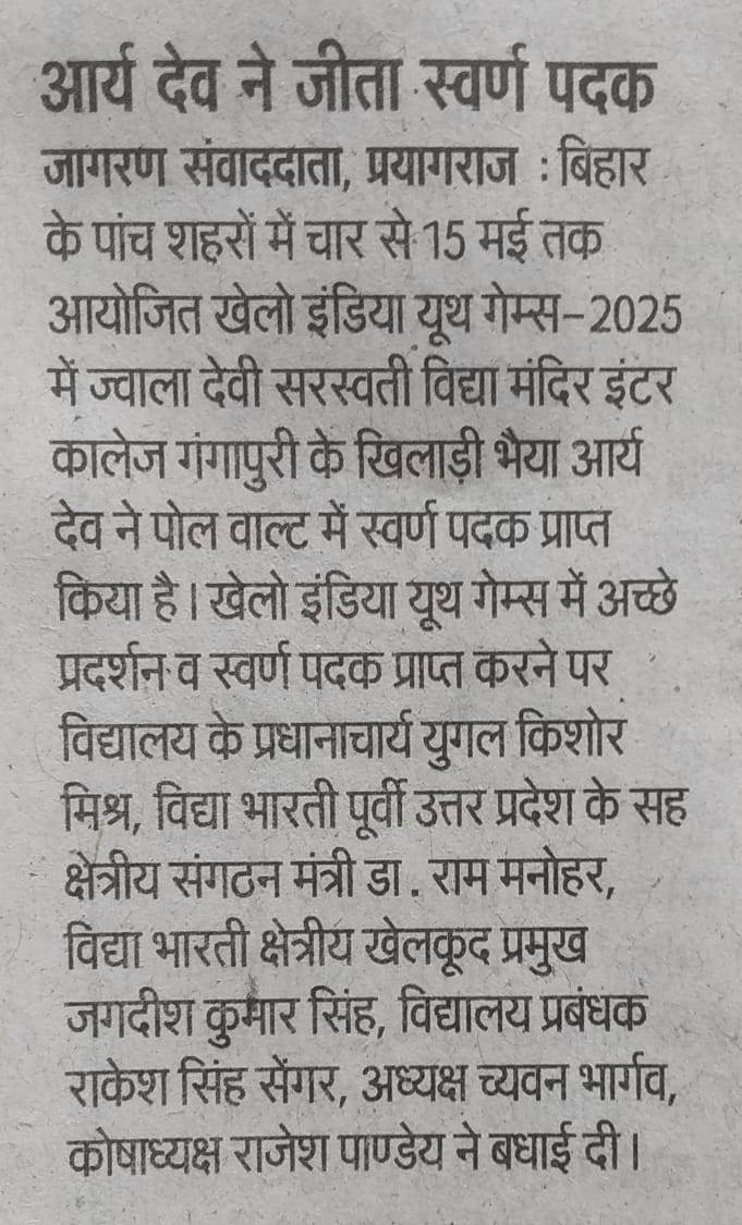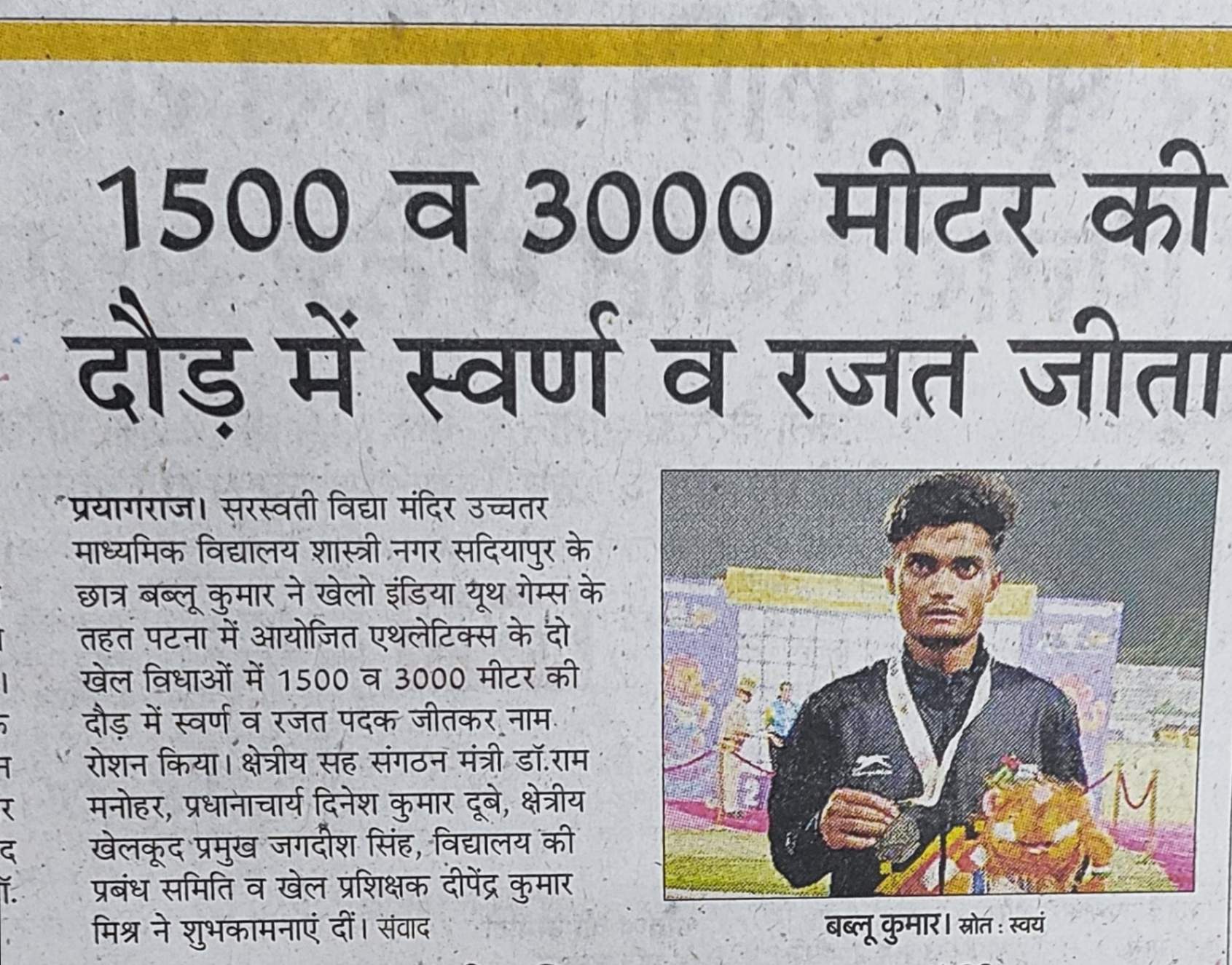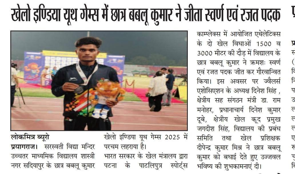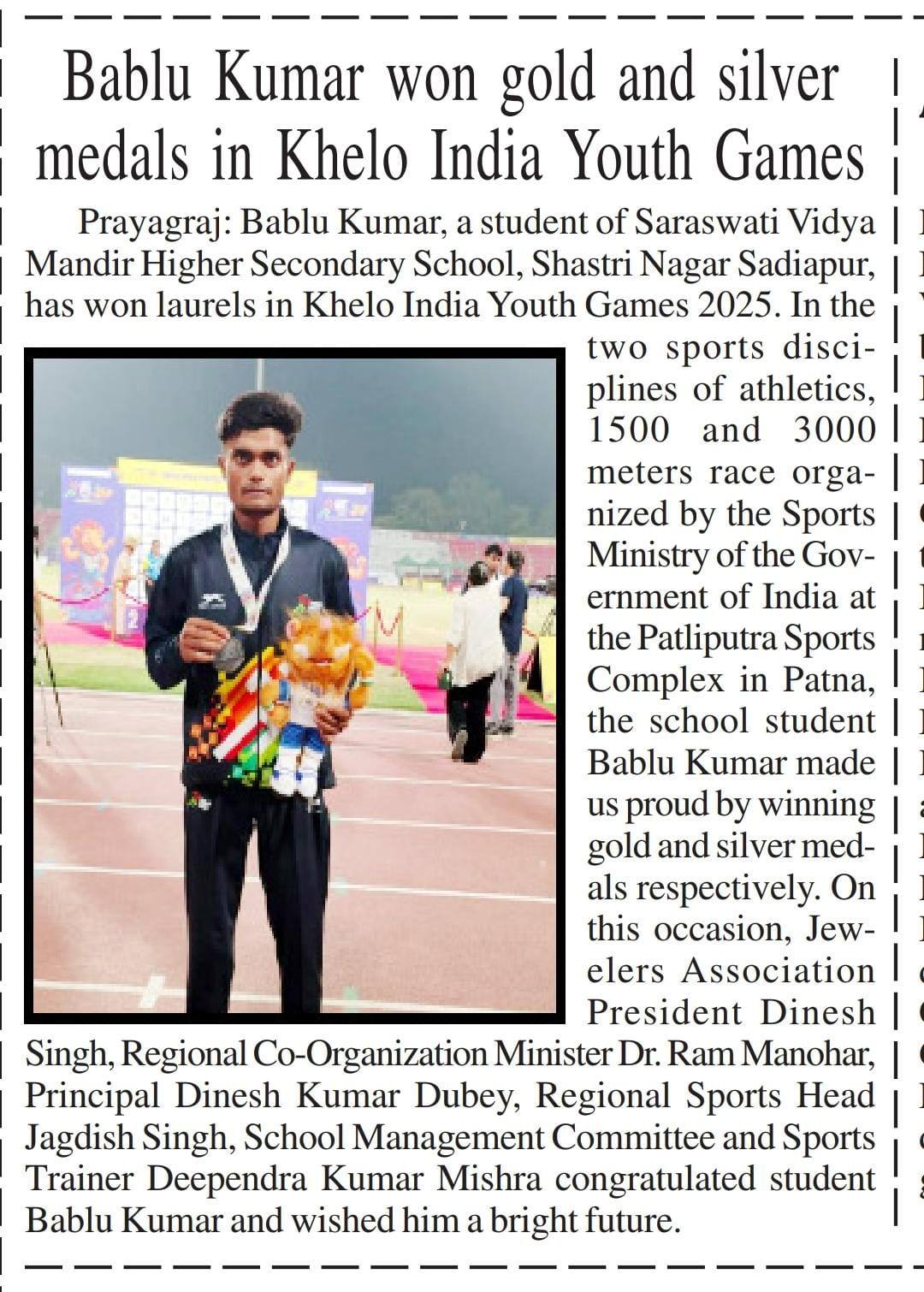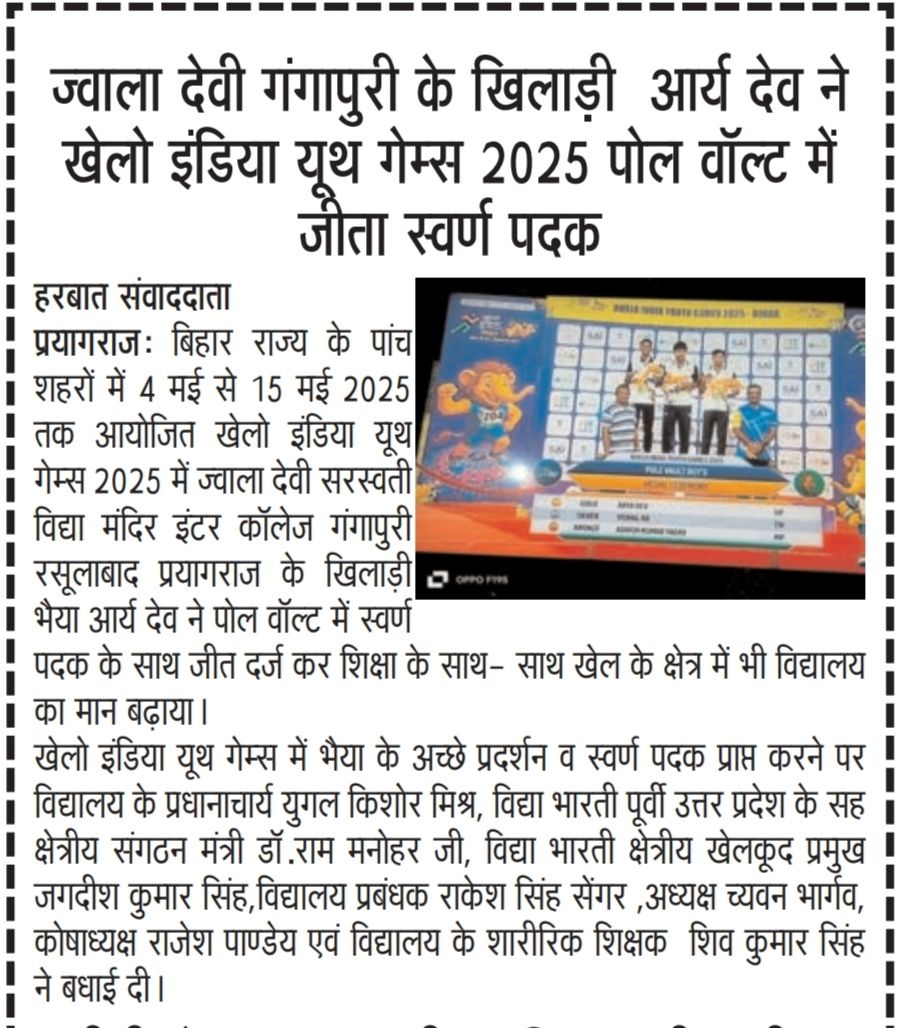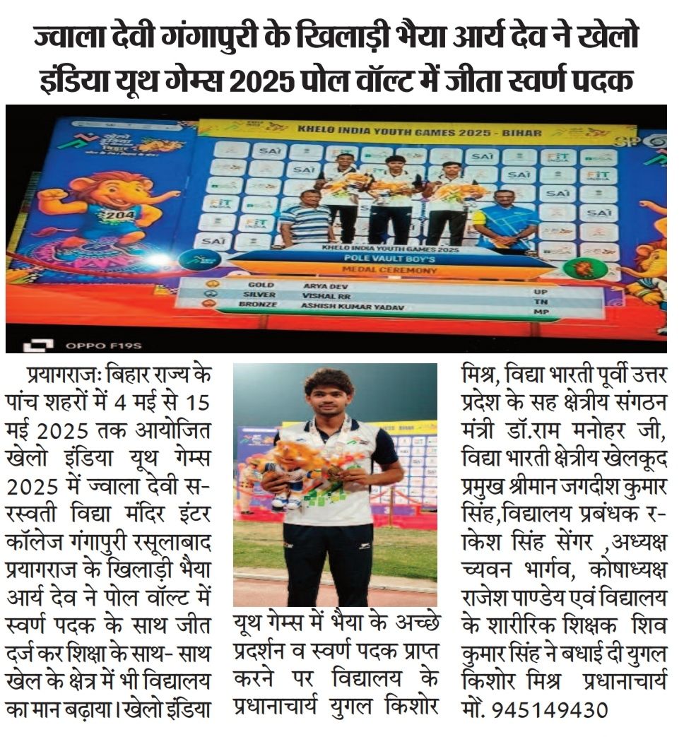बिहार राज्य के पाटलिपुत्र काम्प्लेक्स में 4 मई से 15 मई 2025 तक आयोजित खेलो इंडिया यूथ गेम्स 2025 में विद्याभारती पूर्वी उ०प्र० के विद्यालय ज्वाला देवी सरस्वती विद्या मन्दिर इंटर कॉलेज गंगापुरी रसूलाबाद प्रयागराज के खिलाडी भैया आर्य देव ने पोल वाल्ट में तथा सरस्वती विद्या मन्दिर उच्चतर माध्यमिक विद्यालय शास्त्री नगर सदियापुर के होनहार छात्र बबलू कुमार ने दौड़ में स्वर्ण पदक के साथ जीत दर्ज कर शिक्षा के साथ-साथ खेल के क्षेत्र में भी विद्यालय का मान बढाया है |