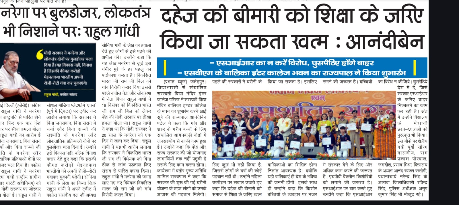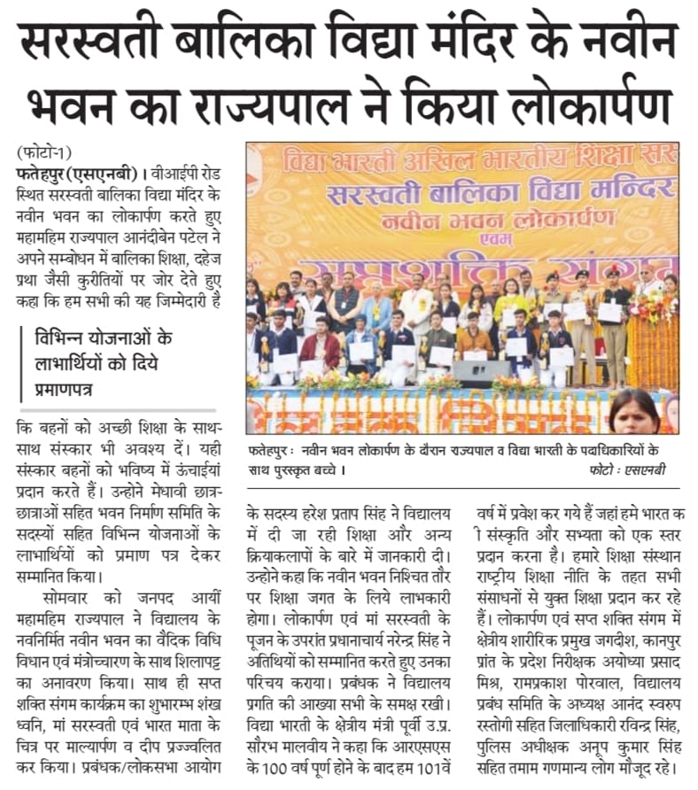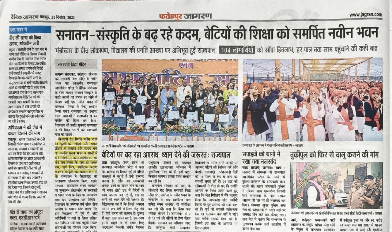 आज दिनांक 22 दिसंबर 2025 को सरस्वती विद्या मन्दिर इण्टर कॉलेज, वी.आई.पी. रोड, फतेहपुर में भव्य नवीन भवन का लोकार्पण माननीय राज्यपाल उत्तर प्रदेश श्रीमती आनंदीबेन पटेल जी के कर-कमलों द्वारा संपन्न हुआ।