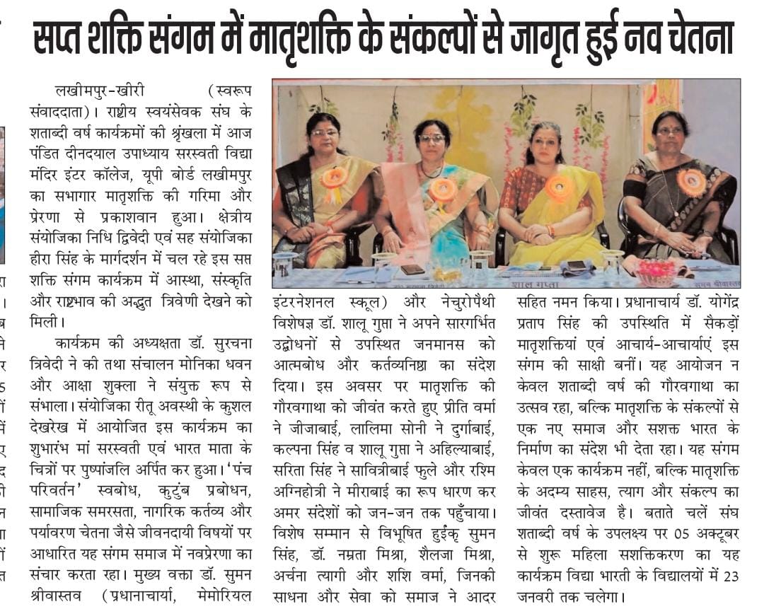 рдкрдВреж рджреАрдирджрдпрд╛рд▓ рдЙрдкрд╛рдзреНрдпрд╛рдп рд╕рд░рд╕реНрд╡рддреА рд╡рд┐рджреНрдпрд╛ рдордВрджрд┐рд░ рдЗрдВрдЯрд░ рдХреЙрд▓реЗрдЬ, рдЙрджрдпрдкреБрд░ (рдЧреЛрд▓рд╛ рд░реЛрдб), рд▓рдЦреАрдордкреБрд░ рдЦреАрд░реА рдореЗрдВ рдЖрдЬ тАШрд╕рдкреНрддрд╢рдХреНрддрд┐ рд╕рдВрдЧрдотАЩ рдХрд╛рд░реНрдпрдХреНрд░рдо рдХрд╛ рднрд╡реНрдп рдПрд╡рдВ рдкреНрд░реЗрд░рдгрд╛рджрд╛рдпрдХ рдЖрдпреЛрдЬрди рд╕рдВрдкрдиреНрди рд╣реБрдЖред